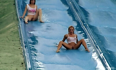 Lesbian sex of 2 porn starlets in a steamy setting by the pool