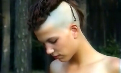 Skinny and tall punk female with two crazy men in the forest