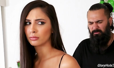 Yam-sized tittied ghetto chick with ginormous boobs swallows big white cock in the glory hole room